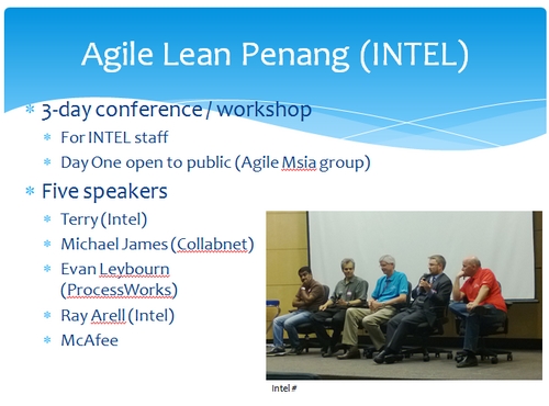 I presented a quick sharing on the learnings from the Agile Lean Penang held in July. It’s impressive to consider Intel’s hoping to get 10,000 Agilists in their organization by the end of this year; and also comforting to know they think along similar lines as MYOB when it comes to maturing their Agile practices (moving from Scrum to Lean).