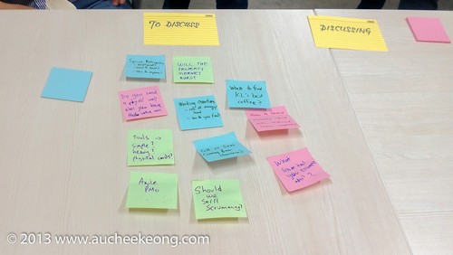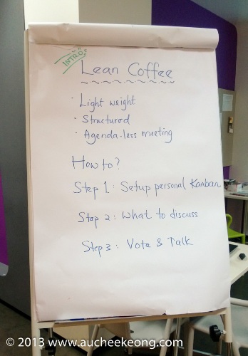 We’ve planning to get into a more regular cadence for running Lean Coffee sessions for Agile Malaysia group. We did one in Sep last year and another one just a few weeks back (Mar 2014). Do keep an eye out on our Facebook site for future Lean Coffee invites. J
